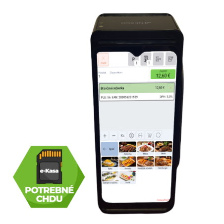 Android zariadenie s aplikáciou FiskalPRO Mobile. Integrovaný platobný terminál, čítačka čiarových a QR kódov. Pripojenie k internetu je možné pomocou WiFi, 4G. Riešenie vhodné pre pevné prevádzky aj mobilný predaj.